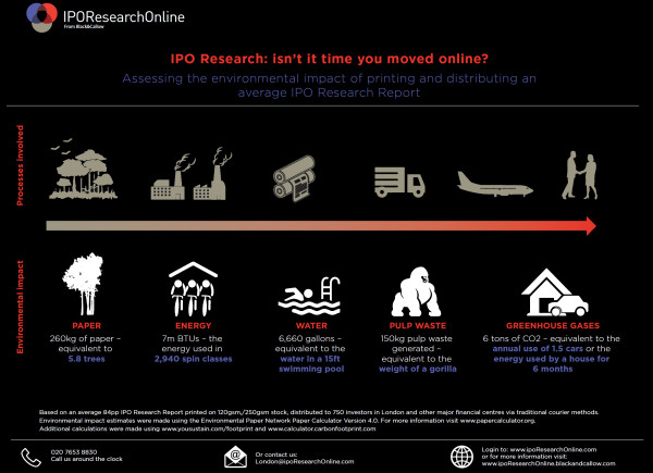 You might be surprised to learn that the greenhouse gases consumed in printing & distributing Research Reports for just one IPO weigh more than the average house uses every six months. Download our graphic to find out more about the environmental impact of your IPO Research.