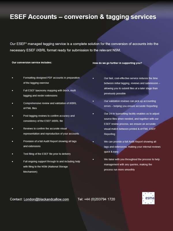 Our ESEF managed tagging service is a complete solution for the conversion of accounts into ESEF iXBRL format. Download the file at left to find out more.